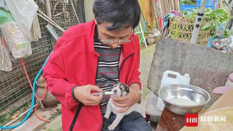 与记者交谈时,他正怀抱着一只尚未睁眼的小奶狗。身旁的碗里盛着牛奶,牛奶被老陈吸进针管,又一口一口喂给小家伙。