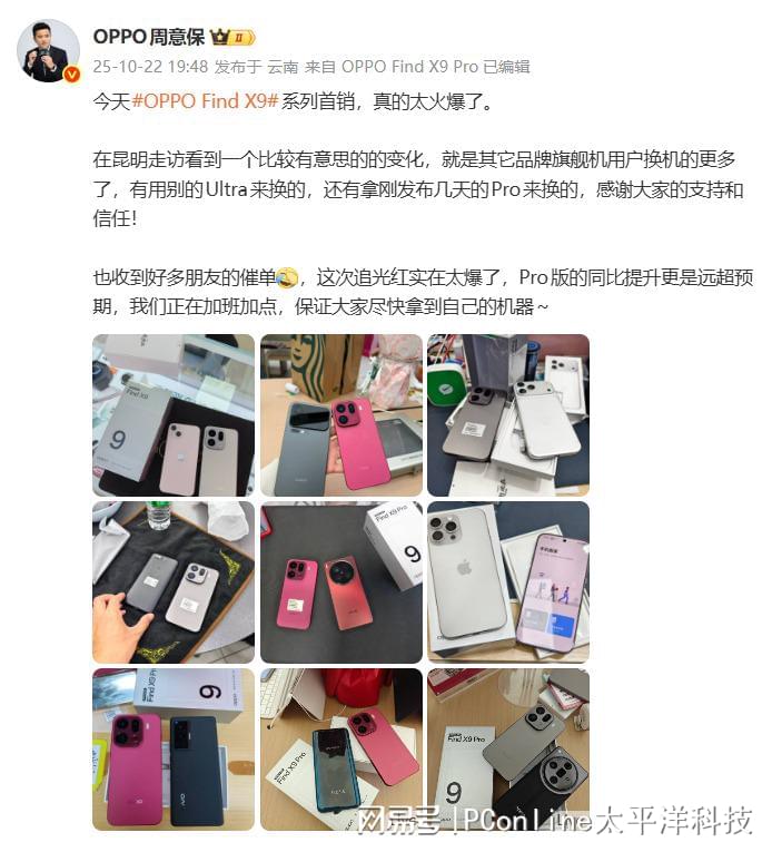 首销当晚,OPPO Find系列产品负责人周意保在微博上发文提到,全国多地门店全面告捷,销售表现强劲,体现了消费者对OPPO Find X9系列产品力的高度认可,也意味着OPPO在高端旗舰市场的布局正在加速深化。